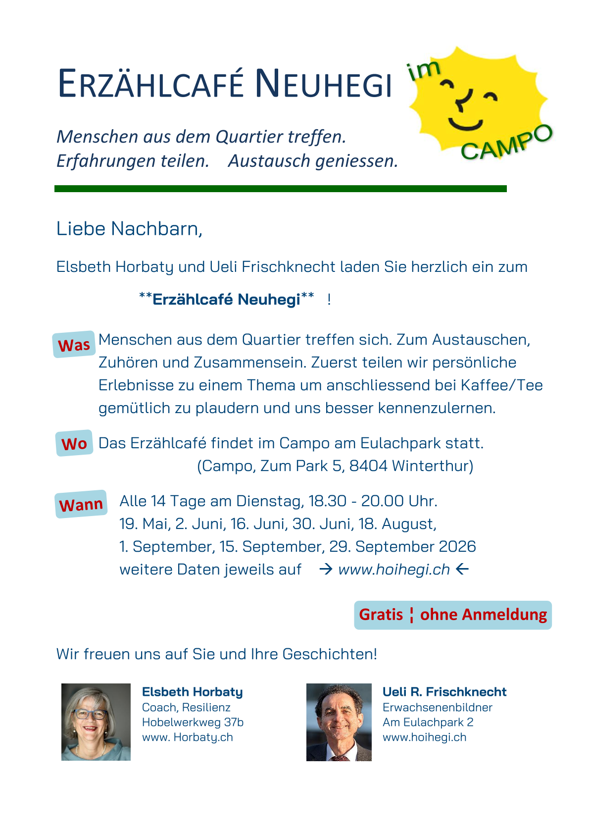 Elsbeth Horbaty und Ueli Frischknecht laden Sie herzlich ein zum Erzählcafé Neuhegi!